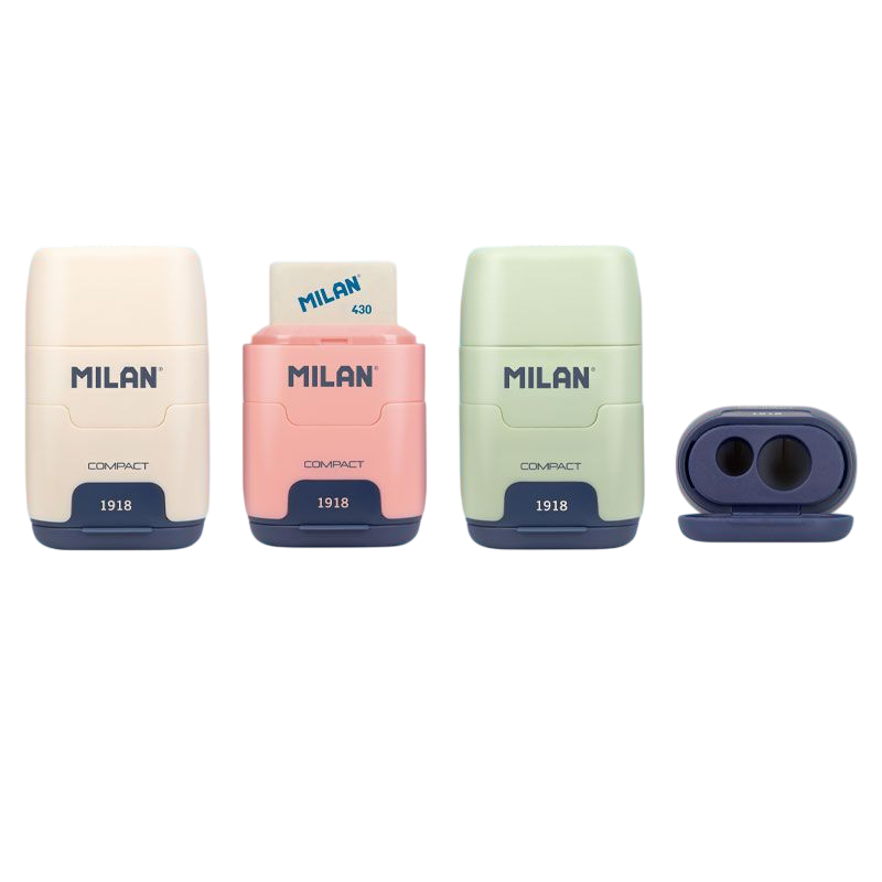 Combinación de goma de borrar y sacapuntas doble (uno estándar y otro MAXI) con depósito. Diseño COMPACT colección 430 since 1918. Goma cuadrada suave de caucho sintético tipo 'miga de pan'. El sacapuntas dispone de una cuchilla de acero afilada y resistente, ideal para todo tipo de lápices. Sacapuntas con cuchilla de seguridad: este sistema evita que se pueda separar la hoja del cuerpo del sacapuntas. 4 colores surtidos: azul marino, blanco, rosa y verde. Diseño original creado por el departamento de I+D de MILAN. Gomas de borrar de recambio disponibles (modelo 430). Colección 430 since 1918, inspirada en los colores y diseño originales de las gomas de borrar MILAN, fabricadas en España desde 1918.