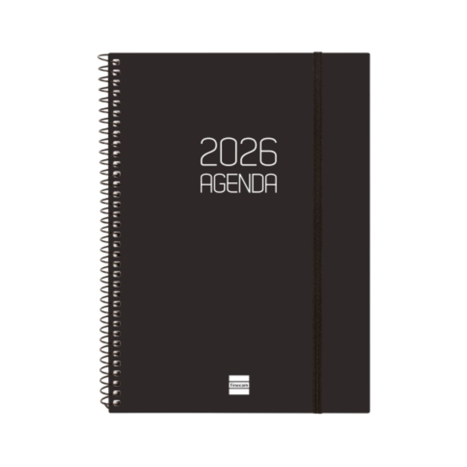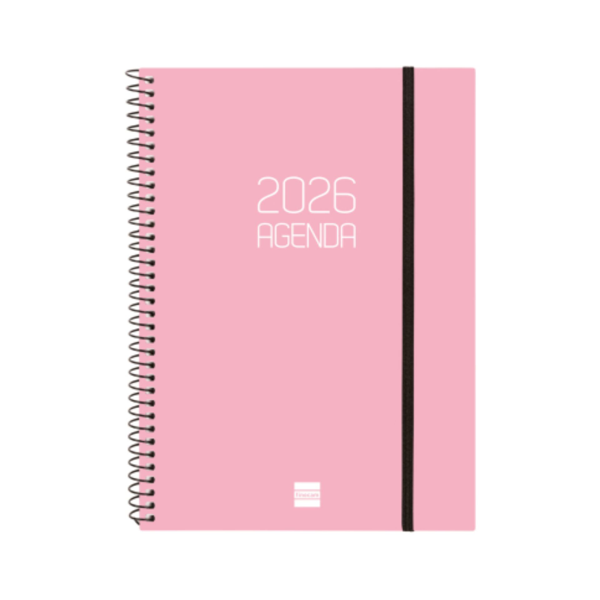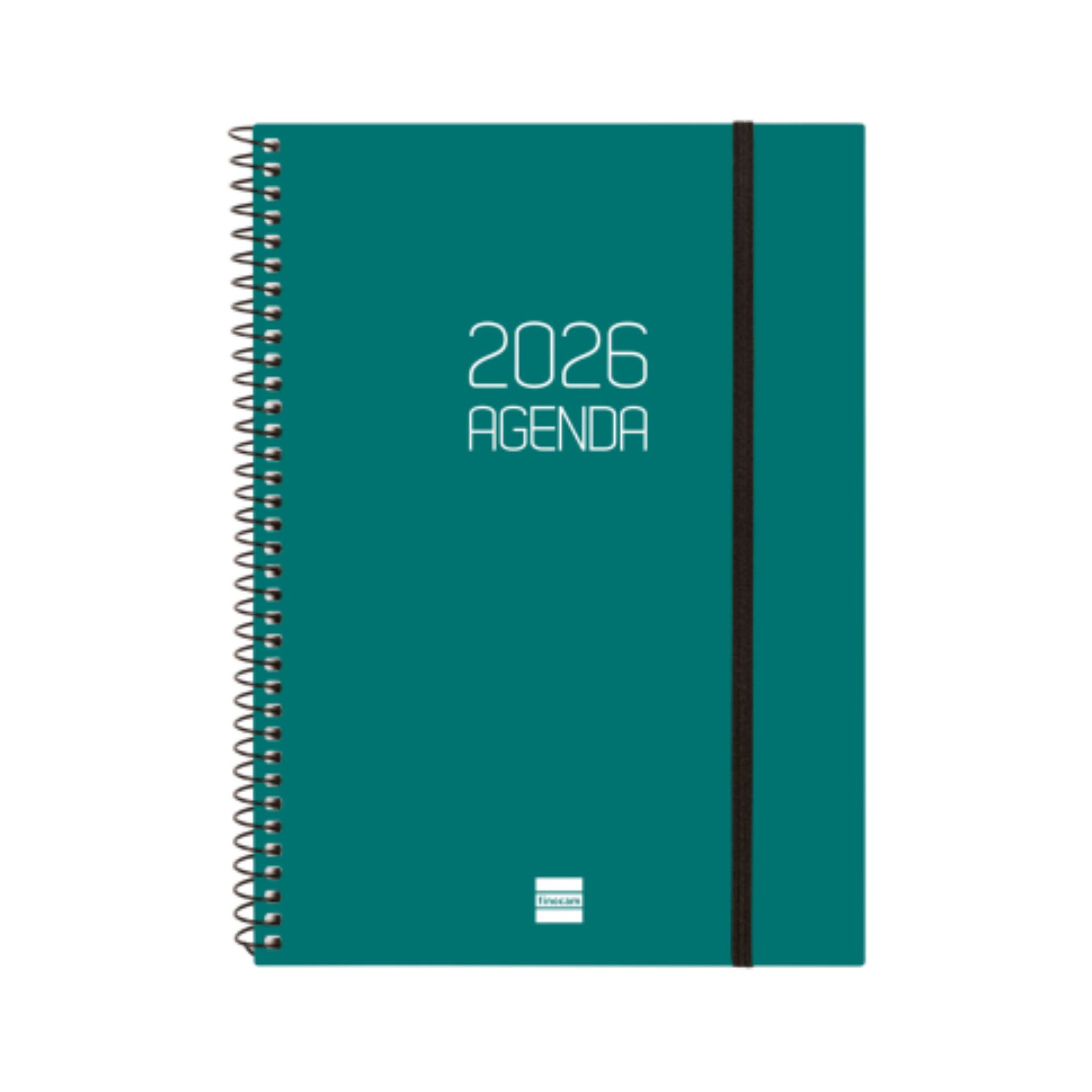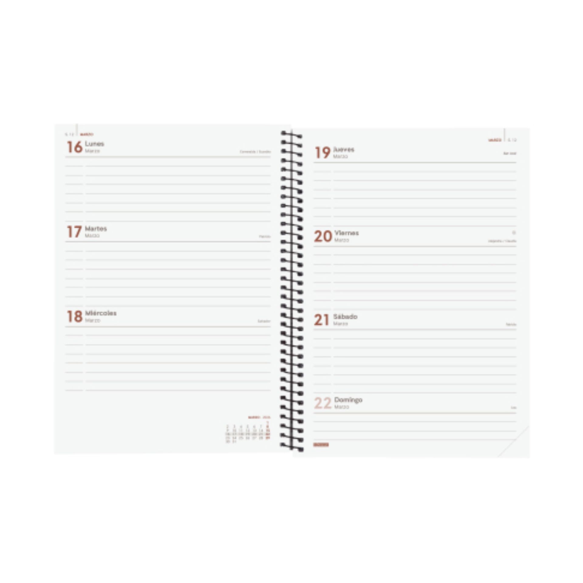 Agenda d´espiral d´estil modern i universal amb tapes lleugeres de polipropilè. Amb goma elàstica. Amb cantonades microperforades per localitzar ràpidament el dia/setmana en curs. Agenda amb informació d'interès a l'anualitat i altres continguts extra.
