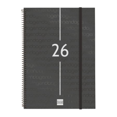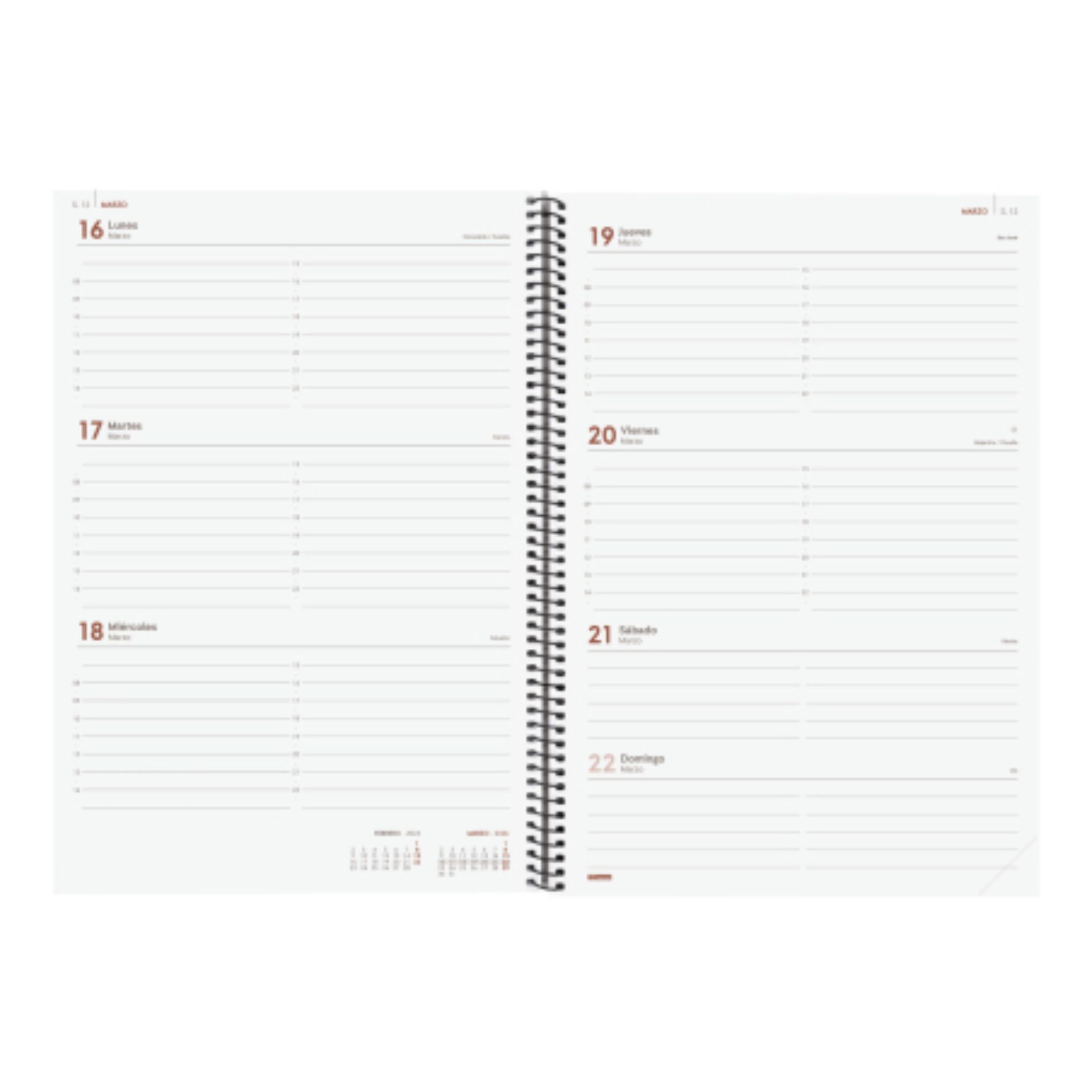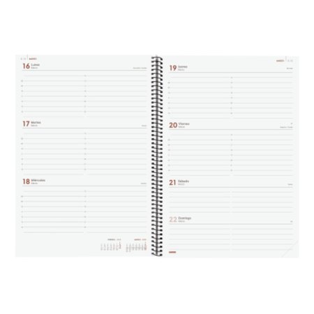 Agenda d´espiral d´estil modern. Amb tapes lleugeres de polipropilè i goma elàstica. Ideal per a ús personal i/o professional. Cantonades microperforades per localitzar ràpidament el dia/setmana en curs. Agenda amb informació d'interès a l'anualitat i altres continguts extra.