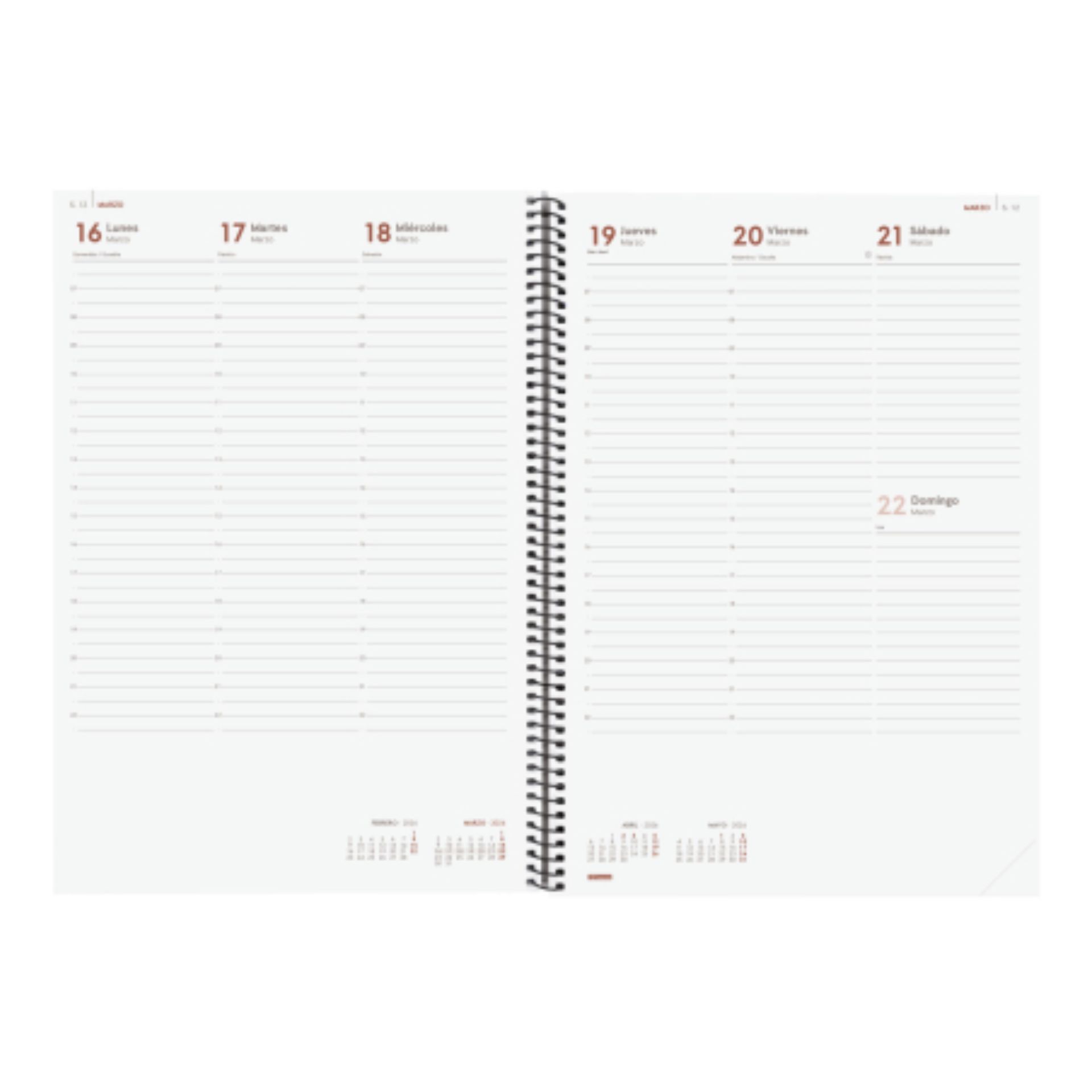 Agenda d´espiral d´estil modern i universal amb tapes lleugeres de polipropilè. Amb goma elàstica. Amb cantonades microperforades per localitzar ràpidament el dia/setmana en curs. Agenda amb informació d'interès a l'anualitat i altres continguts extra.