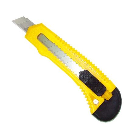 Cúter de plástico color amarillo, apto para cuchillas de 18 mm. Lleva una guía de metal.