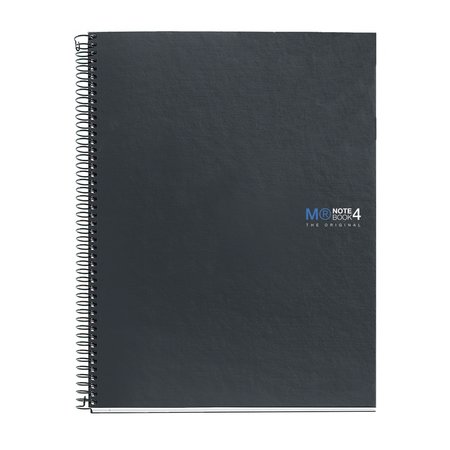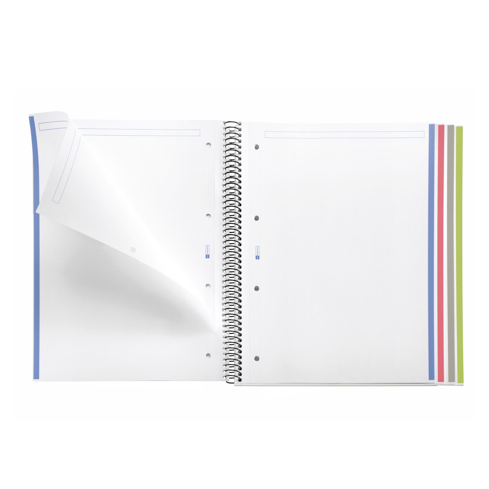 Cuaderno Miquelrius, tamaño A4 (210 x 297 mm). Cubiertas: Cartón extra duro de 1 mm en color grafito plastificado, compacto y super resistente. Espiral: Metálica continua que permite la apertura en plano del cuaderno, además de dar la vuelta completa, y con cierre coilock que evita enganches. Papel interior: extra opaco de 70 g/m², evita que la tinta traspase y seca rápidamente. Hojas: 160 hojas con 4 bandas de color en el lateral (40 hojas por color), ideales para poder clasificar apuntes y usar un color para cada asignatura; cabecera para títulos; microperforado para un arranque limpio y 4 taladros para archivar. Rayado: Liso.
