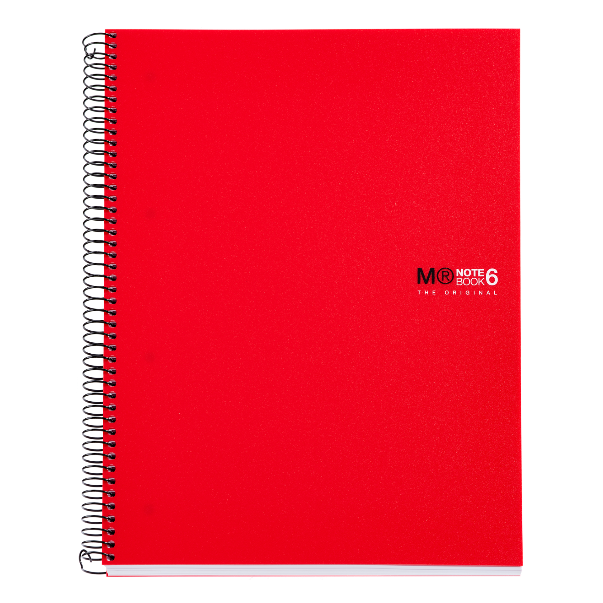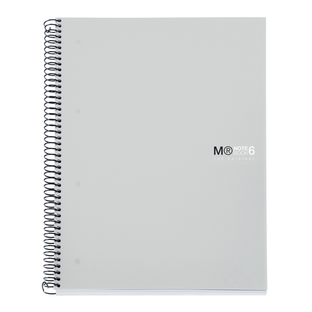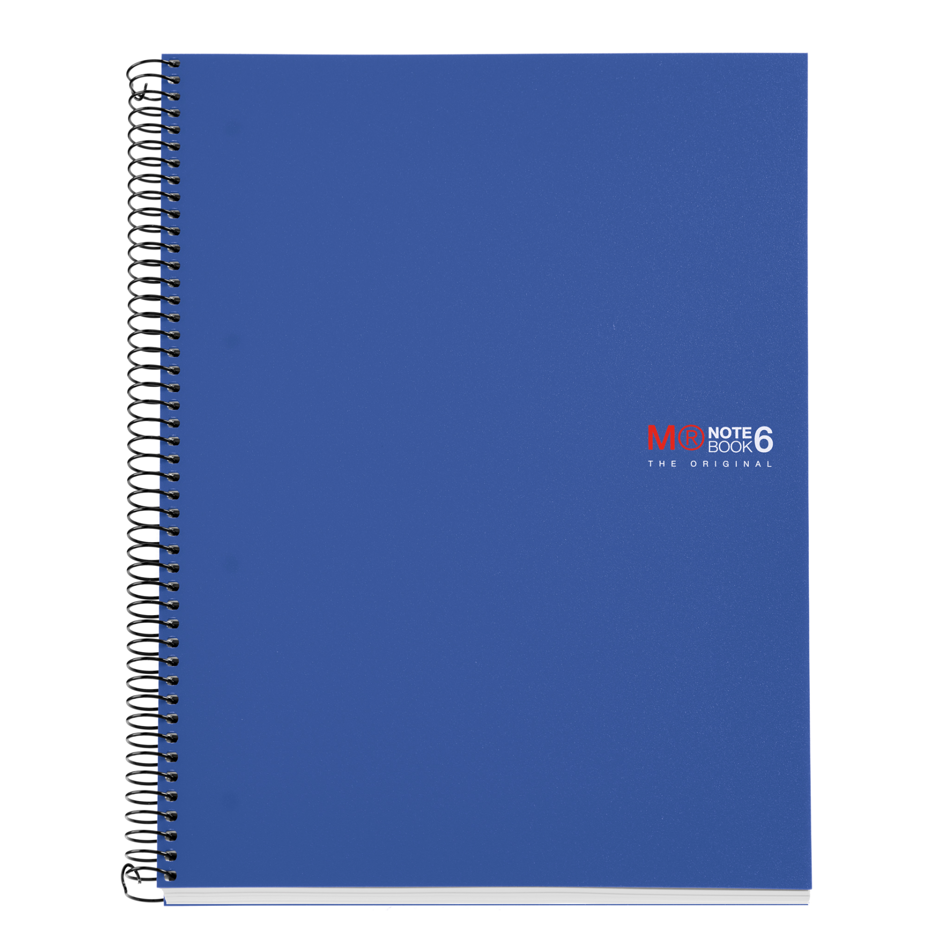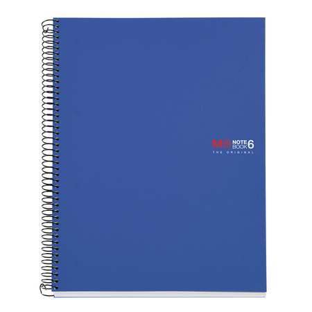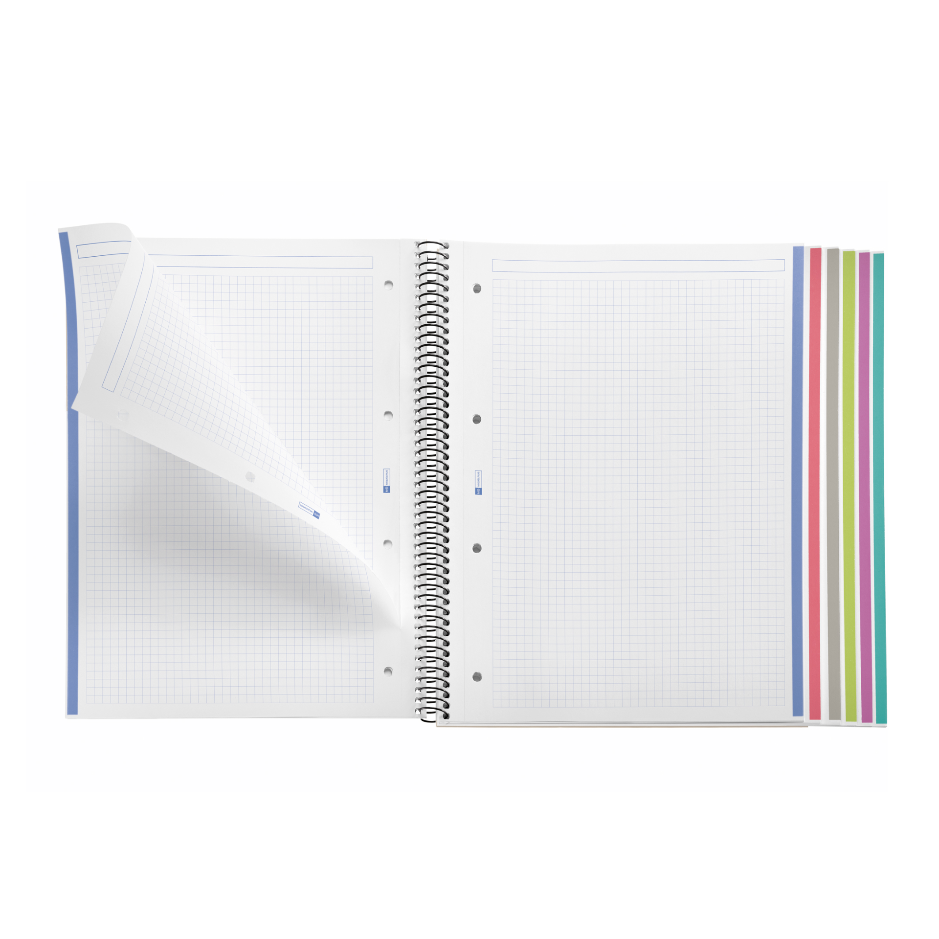 Cuaderno Miquelrius, tamaño A4 (210 x 297 mm). Cubiertas: Polipropileno opaco de 0,8 mm, ligero y resistente. Espiral: Metálica continua que permite la apertura en plano del cuaderno, además de dar la vuelta completa, y con cierre coilock que evita enganches. Papel interior: extra opaco de 70 g/m², evita que la tinta traspase y seca rápidamente. Hojas: 150 hojas con banda de color en el lateral (6 colores, 25 hojas por color), ideales para poder clasificar apuntes y usar un color para cada asignatura; cabecera para títulos; microperforado para un arranque limpio y 4 taladros para archivar. Rayado: Cuadrícula 5 mm.