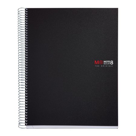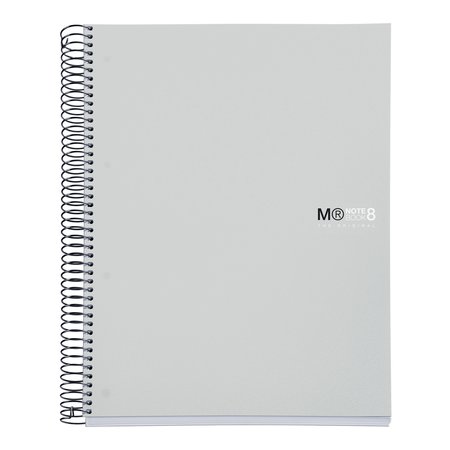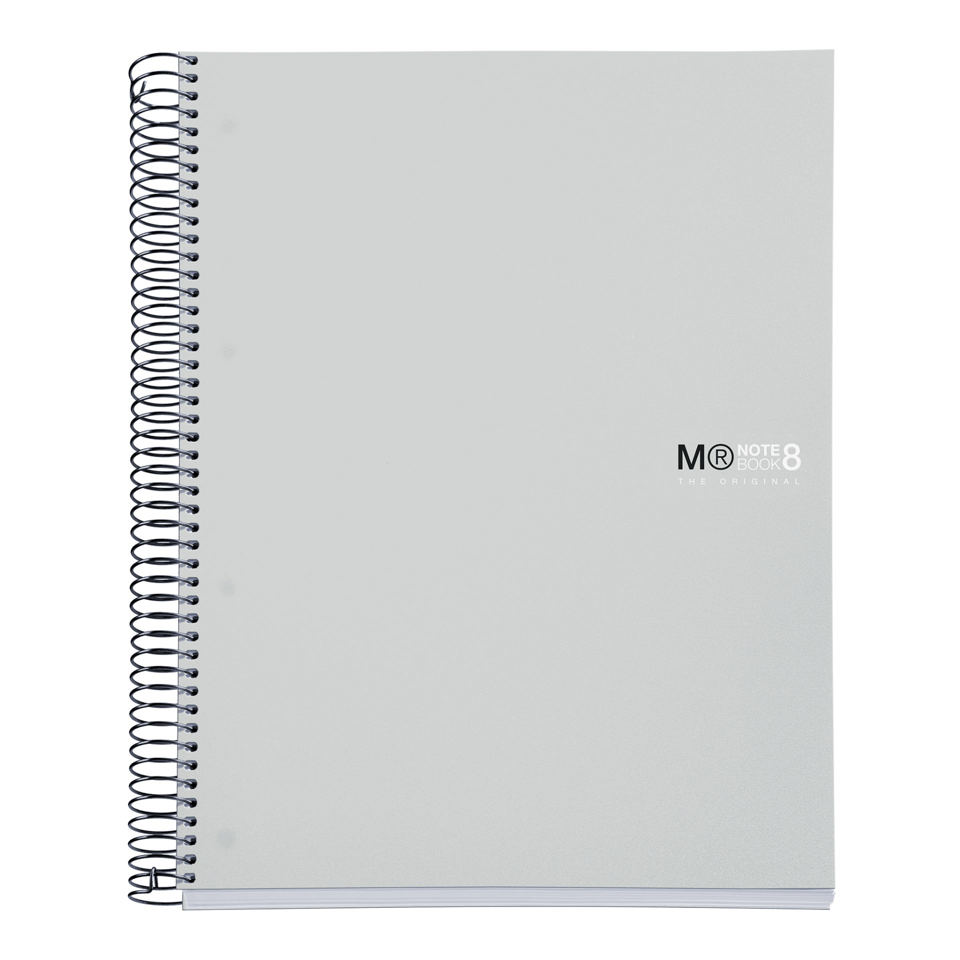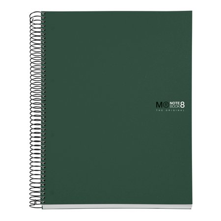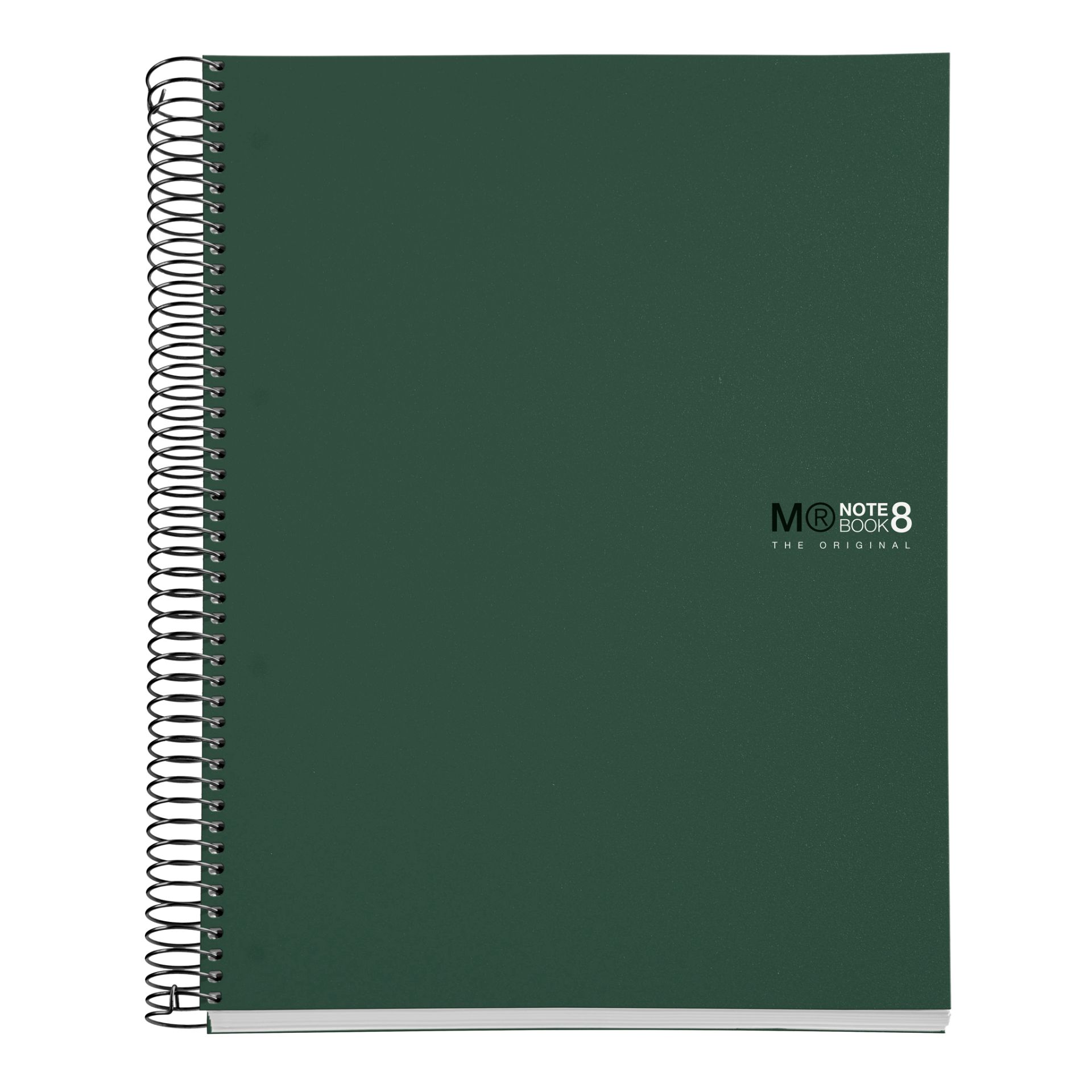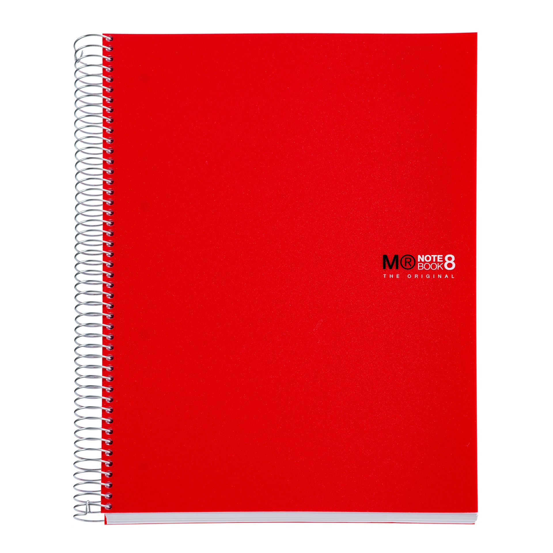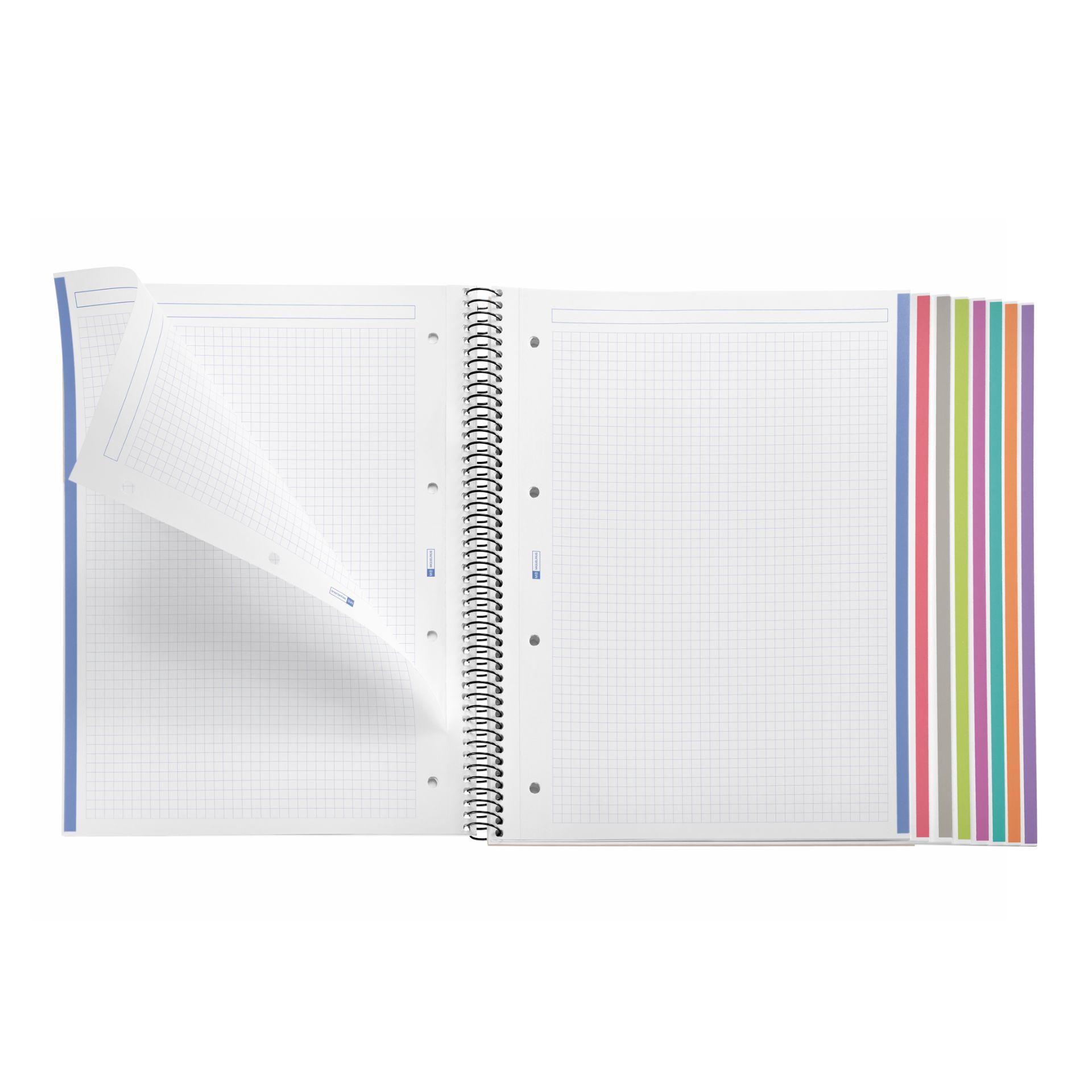 Cuaderno Miquelrius, tamaño A4 (210 x 297 mm). Cubiertas: Polipropileno opaco de 0,8 mm, ligero y resistente. Espiral: Metálica continua que permite la apertura en plano del cuaderno, además de dar la vuelta completa, y con cierre coilock que evita enganches. Papel interior: extra opaco de 70 g/m², evita que la tinta traspase y seca rápidamente. Hojas: 200 hojas con banda de color en el lateral (8 colores, 25 hojas por color), ideales para poder clasificar apuntes y usar un color para cada asignatura; cabecera para títulos; microperforado para un arranque limpio y 4 taladros para archivar. Rayado: Cuadrícula 5 mm.