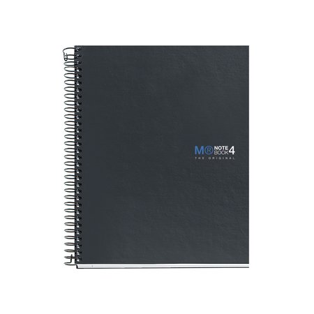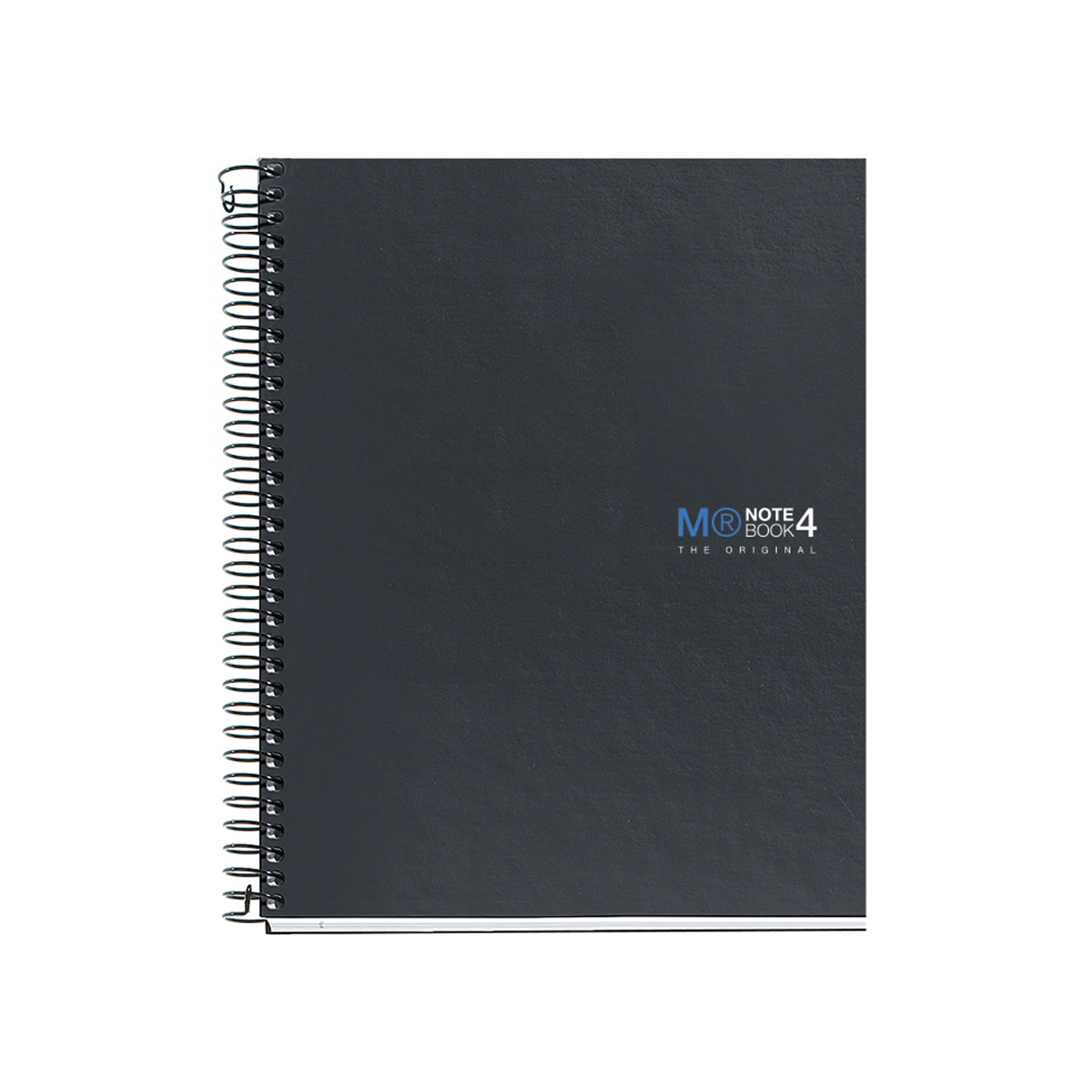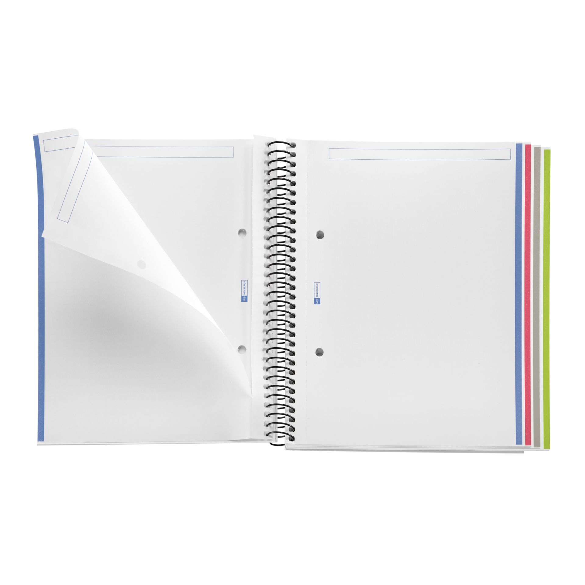 Cuaderno Miquelrius, tamaño A5 (148 x 210 mm). Cubiertas: Cartón extra duro de 1 mm en color grafito plastificado, compacto y super resistente. Espiral: Metálica continua que permite la apertura en plano del cuaderno, además de dar la vuelta completa, y con cierre coilock que evita enganches. Papel interior: extra opaco de 70 g/m², evita que la tinta traspase y seca rápidamente. Hojas: 160 hojas con 4 bandas de color en el lateral (40 hojas por color), ideales para poder clasificar apuntes y usar un color para cada asignatura; cabecera para títulos; microperforado para un arranque limpio y 2 taladros para archivar. Rayado: Liso.