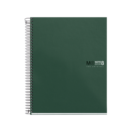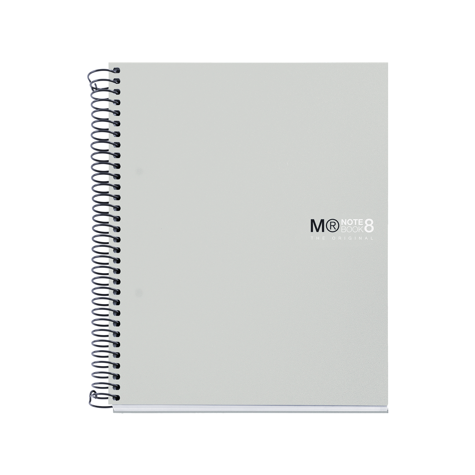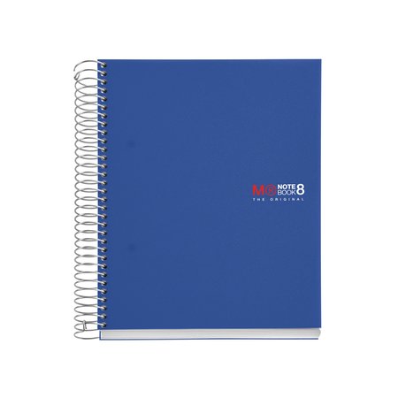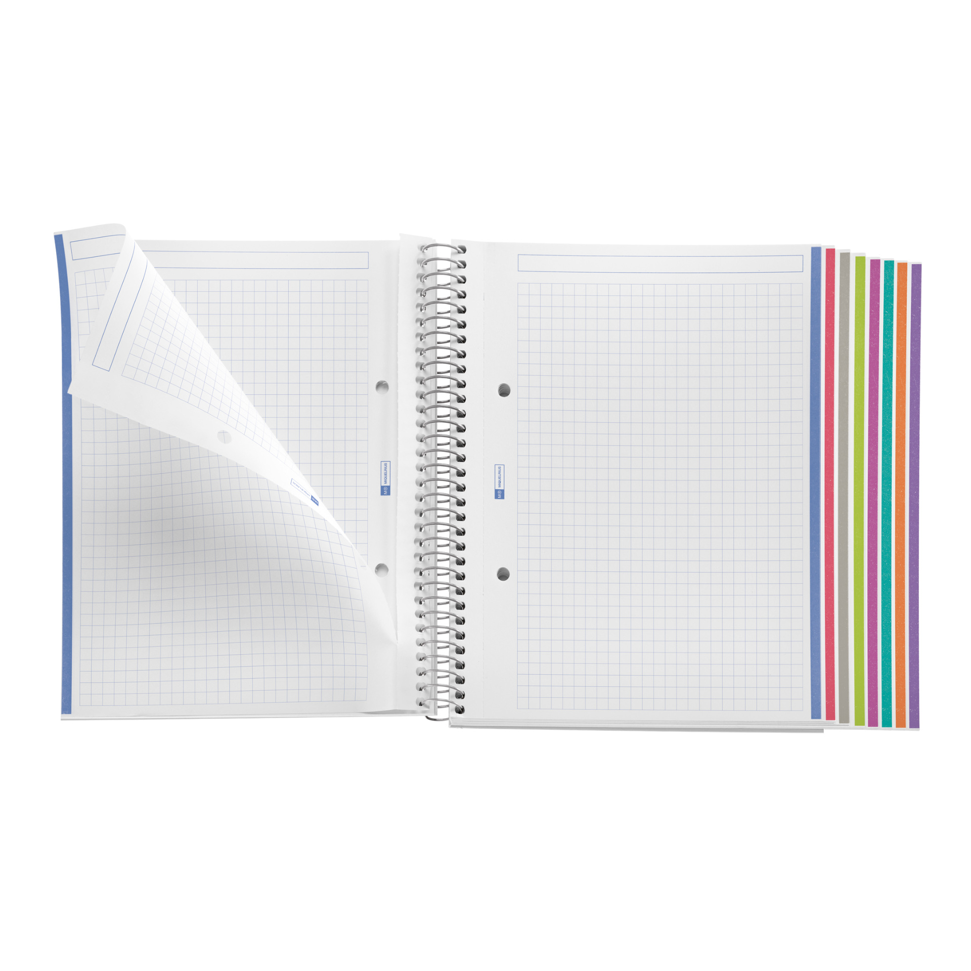 Cuaderno Miquelrius, tamaño A5 (210 x 297 mm). Cubiertas: Polipropileno opaco de 0,8 mm, ligero y resistente. Espiral: Metálica continua que permite la apertura en plano del cuaderno, además de dar la vuelta completa, y con cierre coilock que evita enganches. Papel interior: extra opaco de 70 g/m², evita que la tinta traspase y seca rápidamente. Hojas: 200 hojas con banda de color en el lateral (8 colores, 25 hojas por color), ideales para poder clasificar apuntes y usar un color para cada asignatura; cabecera para títulos; microperforado para un arranque limpio y 2 taladros para archivar. Rayado: Cuadrícula 5 mm.