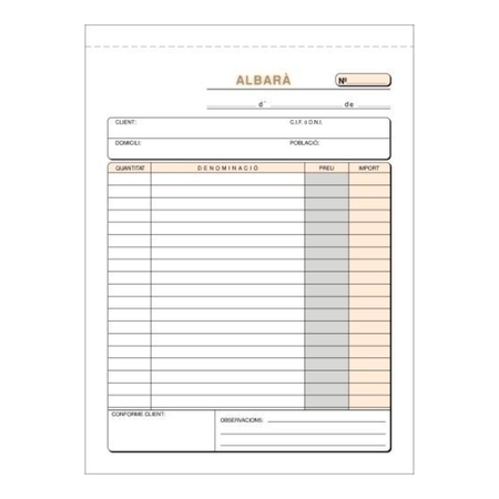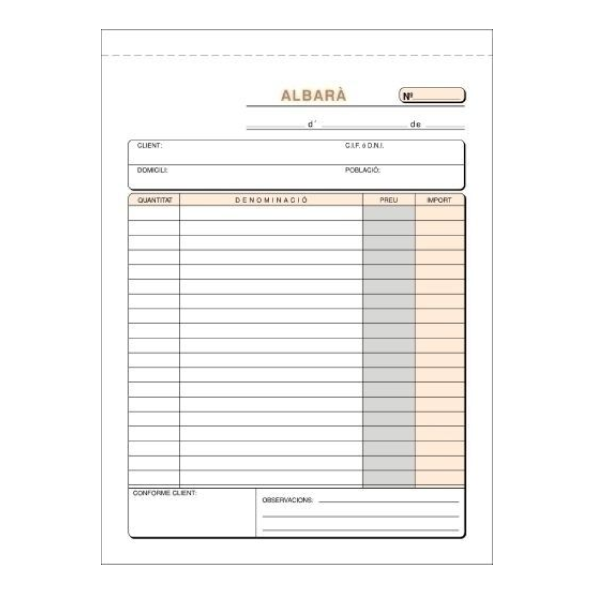 El talonari d’albarans en català de la marca LOAN és l’eina perfecta per a comerços, autònoms i empreses que pretenen dur un registre clar i professional de les entregues i recepcions de mercaderies. Aquest model inclou duplicat autocopiatiu (original + còpia sense necessitat de paper carbó) en format 4º natural (aproximadament 15 × 21 cm) i consta de 50 fulls preimpressos amb dues tintes. El talonari incorpora separador de cartró, paper original litos blanc de 50 g i còpia química rosa, i està redactat íntegrament en català per adaptar-se al mercat local i ajudar a projectar una imatge de proximitat i rigor empresarial. Ideal per a la gestió documental d’albarans i entregues, facilita l’arxiu, el seguiment i l’organització administrativa sense complicacions.